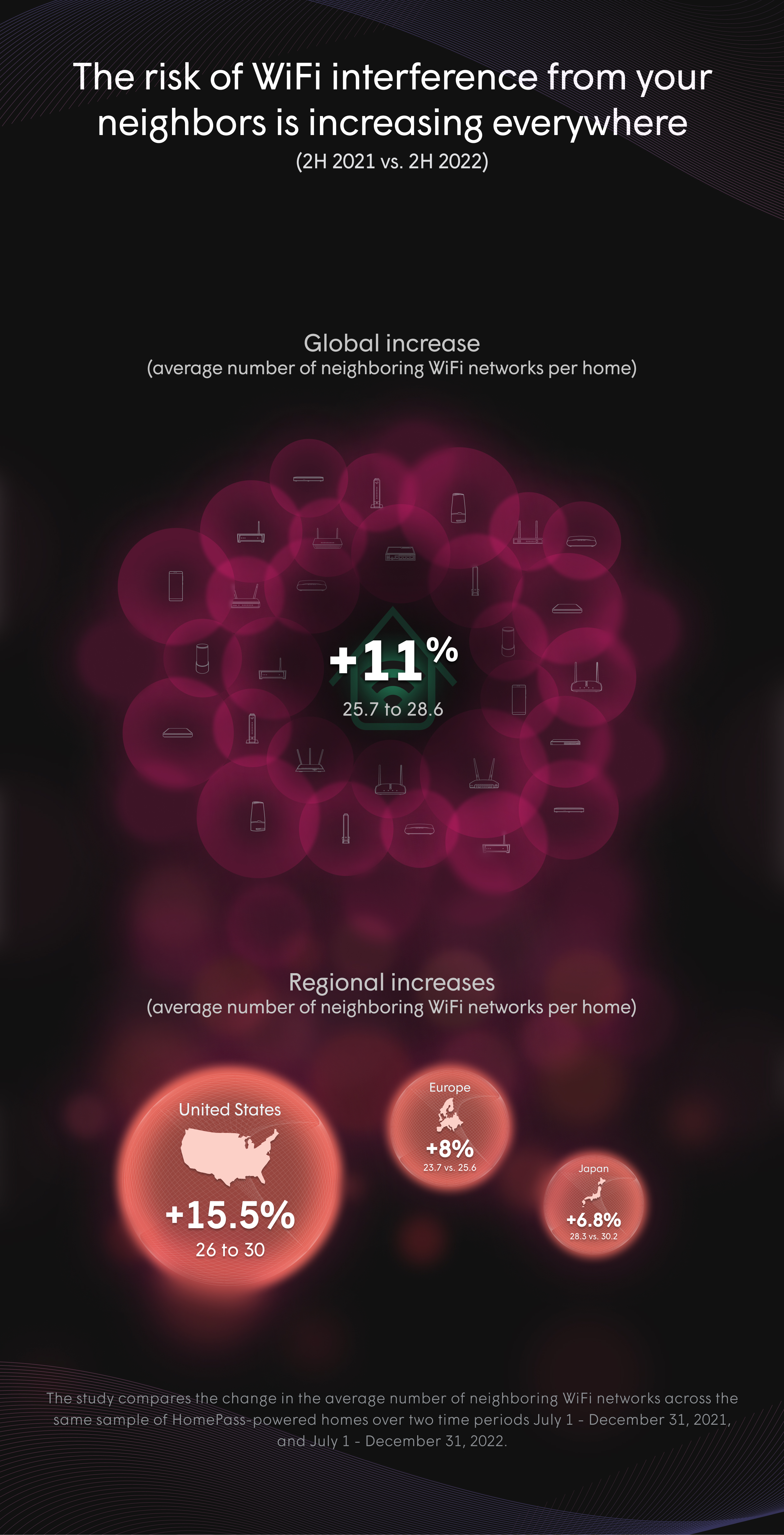 When comparing the second half of 2021 with the second half of 2022, the average number of surrounding networks had increased by 11% to an average of 28.6 per home, globally. That’s nearly 29 WiFi networks competing for the same airspace, leaving service providers and their customers with possible interference headaches that if not managed proactively, could lead to significant quality of experience (QoE) issues. At a regional level, the US saw the largest increase (+15.5%), followed by Europe (+8%) and Japan (+6.8%), with Japan recording the highest number of neighboring networks with 30.2.